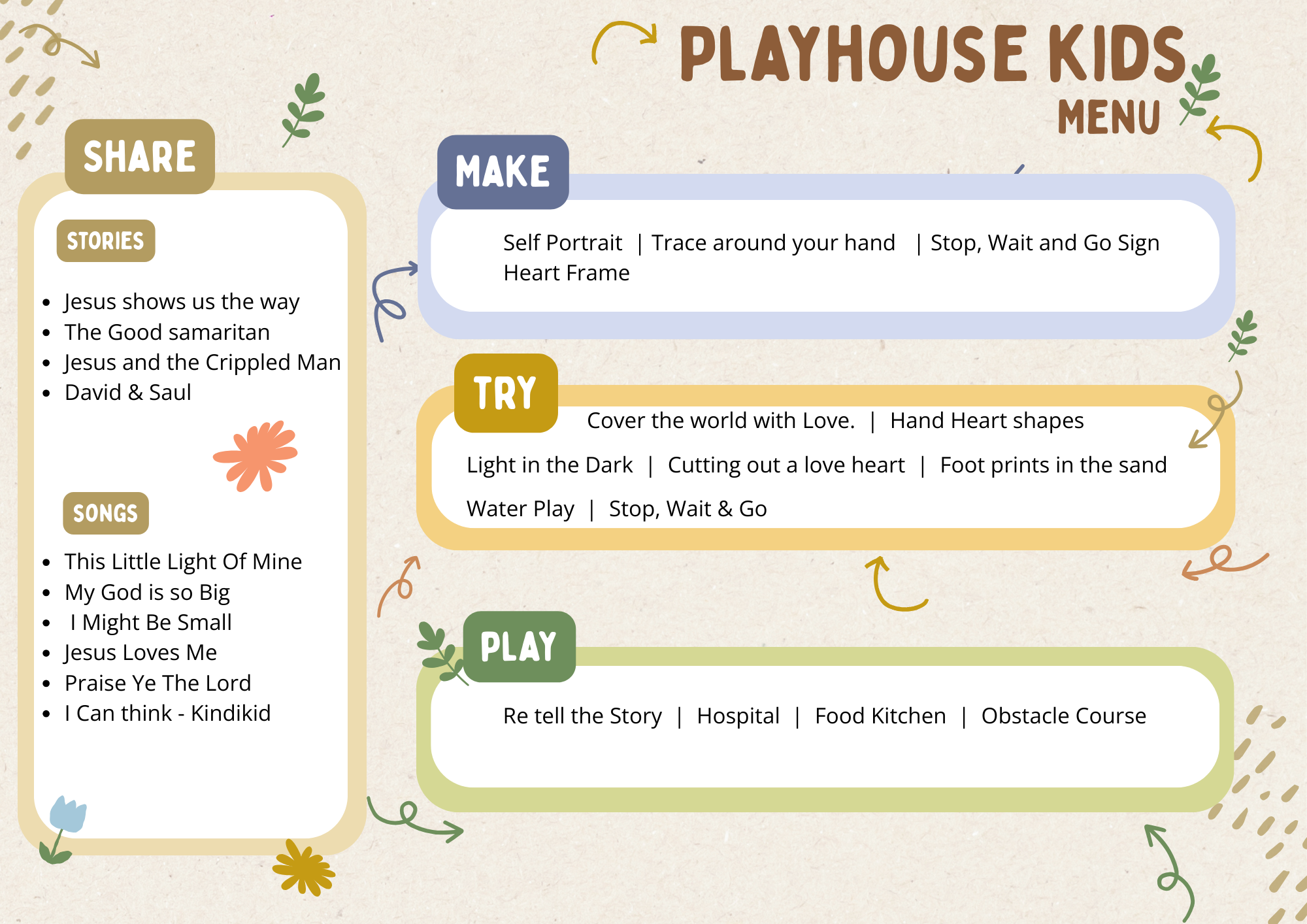 On this page the content is in the order of our Kids Connect Playhouse Time. Our hosts use the images as prompts for what’s next.